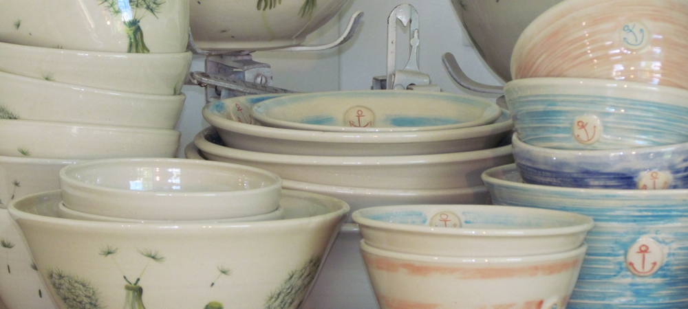 Meine Keramik ist liebevoll in alten Schränken, auf einem alten Herd, an weißgestrichenen Holztüren und in Fensterrahmen dekoriert. An der hinteren Wand steht der Ofen, in dem meine Keramik bei 1200 Grad Celsius gebrannt wird. Hier drehe ich mir die Welt, wie sie mir gefällt.